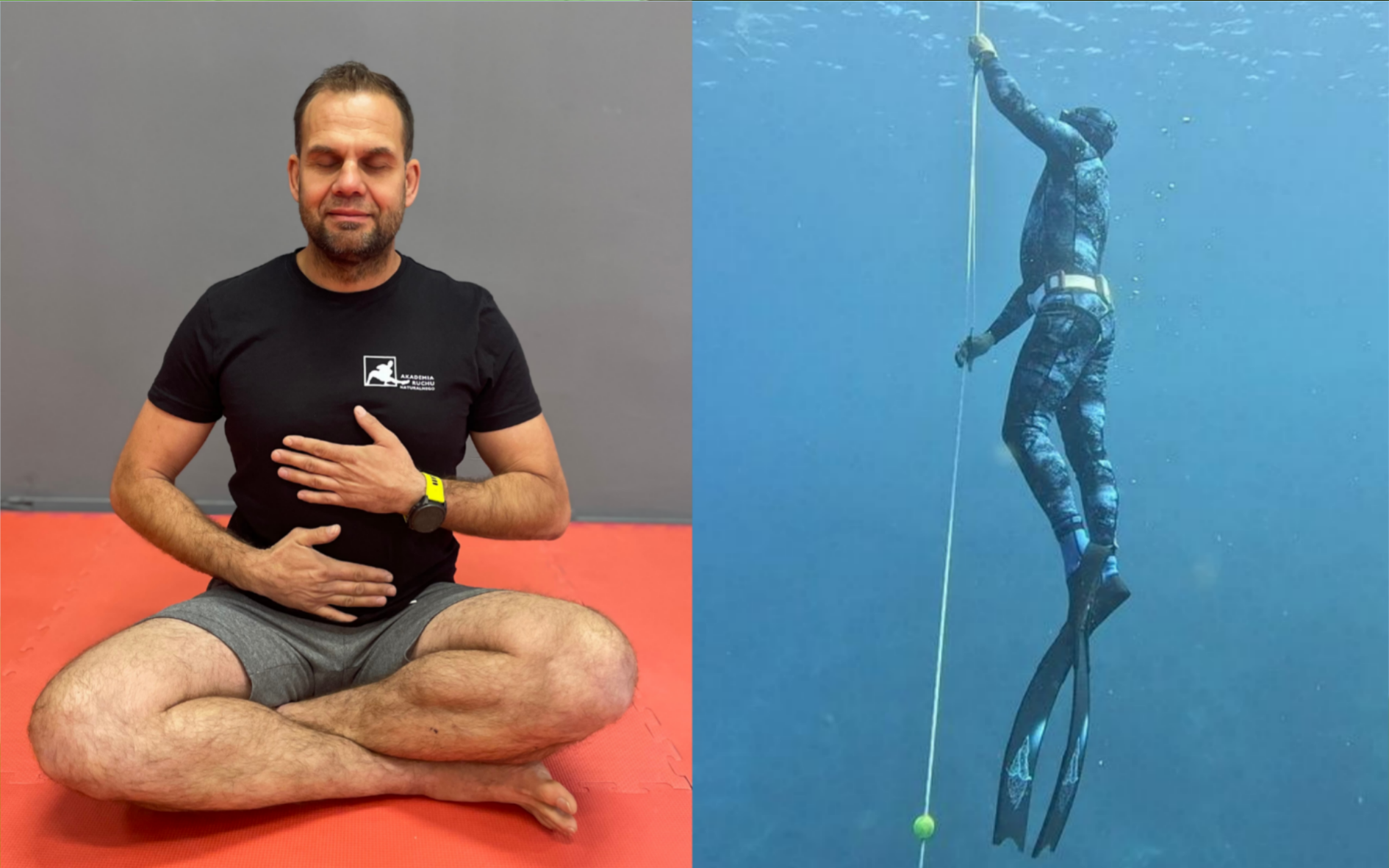 “Zanim zacząłem trenować Ruch Naturalny, nie zdawałem sobie sprawy, jak wielki wpływ na moje ciało i umysł może mieć świadomy oddech. Dzięki ćwiczeniom nauczyłem się kontrolować oddech, oddychać spokojniej i głębiej oraz lepiej panować nad reakcją organizmu na wysiłek. Ta umiejętność okazała się kluczowa w mojej pasji – freedivingu. Podczas zanurzeń potrafię teraz znacznie dłużej wytrzymać na wstrzymanym oddechu, a każdy kolejny metr w dół daje mi poczucie większej pewności i bezpieczeństwa. Trening Ruchu Naturalnego nie tylko wzmocnił moje ciało, ale też nauczył mnie opanowania, koncentracji i spokoju, które pod wodą są równie ważne jak kondycja. To doświadczenie pokazuje mi, że granice, które sobie stawiamy, są często tylko w naszej głowie – a dzięki systematycznej pracy można je przesuwać coraz dalej”.